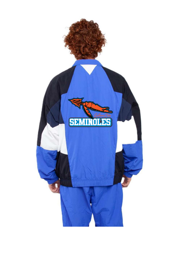 We heat press a large Seminoles logo on the back of this Shaka Wear Track Suit Jacket in Royal Blue that comes with matching pants.