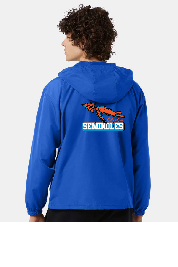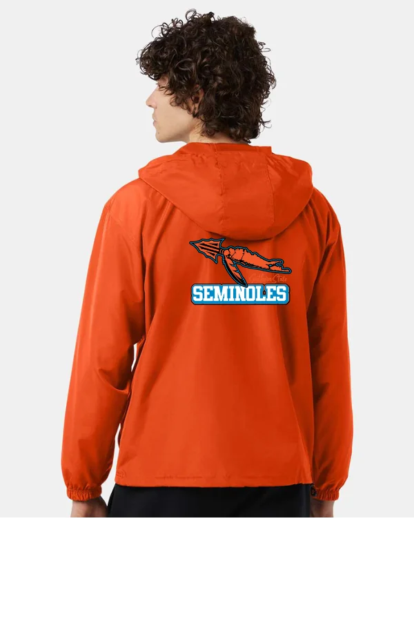 We heat press a large Seminoles logo on the back of this Champion Unisex Windbreaker in White, Orange or Blue (not available in black).